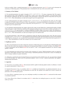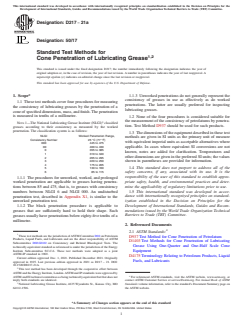ASTM D217-21a: Standard Test Methods for Cone Penetration of Lubricating Grease specifies procedures to evaluate the consistency of lubricating greases using cone penetration tests. Developed by ASTM International, this standard covers four primary procedures-unworked, worked, prolonged worked, and block penetration-allowing measurement of grease consistency across the full range of National Lubricating Grease Institute (NLGI) numbers from 000 to 6. Results are instrumental in manufacturing quality control, product specification, and material classification for industrial and automotive lubricants.