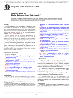 ASTM E2736-17(2022) is a guide published by ASTM International. Its full title is "Standard Guide for Digital Detector Array Radiography". This standard covers: SIGNIFICANCE AND USE 4.1 This standard provides a guide for the other DDA standards (see Practices E2597, E2698, and E2737). It is not intended for use with computed radiography apparatus. Figure 1 describes how this standard is interrelated with the aforementioned standards. FIG. 1 Flow Diagram Representing the Connection Between the Four DDA Standards 4.2 This guide is intended to assist the user to understand the definitions and corresponding performance parameters used in related standards as stated in 4.1 in order to make an informed decision on how a given DDA can be used in the target application. 4.3 This guide is also intended to assist cognizant engineering officers, prime manufacturers, and the general service and manufacturing customer base that may rely on DDAs to provide advanced radiological results so that these parties may set their own acceptance criteria for use of these DDAs by suppliers and shops to verify that their parts and structures are of sound integrity to enter into service. 4.4 The manufacturer characterization standard for DDA (see Practice E2597) serves as a starting point for the end user to select a DDA for the specific application at hand. DDA manufacturers and system integrators will provide DDA performance data using standardized geometry, X-ray beam spectra, and phantoms as prescribed in Practice E2597. The end user will look at these performance results and compare DDA metrics from various manufacturers and will decide on a DDA that can meet the specification required for inspection by the end user. See Sections 5 and 8 for a discussion on the characterization tests and guidelines for selection of DDAs for specific applications. 4.5 Practice E2698 is designed to assist the end user to set up the DDA with minimum requirements for radiological examinations. This standard will also help the user to get the required SNR, to set up the required magnification, and provides guidance for viewing and storage of radiographs. Discussion is also... SCOPE 1.1 This standard is a user guide, which is intended to serve as a tutorial for selection and use of various digital detector array systems nominally composed of the detector array and an imaging system to perform digital radiography. This guide also serves as an in-detail reference for the following standards: Practices E2597, E2698, and E2737. 1.2 This standard does not purport to address all of the safety concerns, if any, associated with its use. It is the responsibility of the user of this standard to establish appropriate safety, health, and environmental practices and determine the applicability of regulatory limitations prior to use. 1.3 This international standard was developed in accordance with internationally recognized principles on standardization established in the Decision on Principles for the Development of International Standards, Guides and Recommendations issued by the World Trade Organization Technical Barriers to Trade (TBT) Committee.