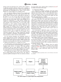 SIGNIFICANCE AND USE 4.1 This standard provides a guide for the other DDA standards (see Practices E2597, E2698, and E2737). It is not intended for use with computed radiography apparatus. Figure 1 describes how this standard is interrelated with the aforementioned standards. FIG. 1 Flow Diagram Representing the Connection Between the Four DDA Standards 4.2 This guide is intended to assist the user to understand the definitions and corresponding performance parameters used in related standards as stated in 4.1 in order to make an informed decision on how a given DDA can be used in the target application. 4.3 This guide is also intended to assist cognizant engineering officers, prime manufacturers, and the general service and manufacturing customer base that may rely on DDAs to provide advanced radiological results so that these parties may set their own acceptance criteria for use of these DDAs by suppliers and shops to verify that their parts and structures are of sound integrity to enter into service. 4.4 The manufacturer characterization standard for DDA (see Practice E2597) serves as a starting point for the end user to select a DDA for the specific application at hand. DDA manufacturers and system integrators will provide DDA performance data using standardized geometry, X-ray beam spectra, and phantoms as prescribed in Practice E2597. The end user will look at these performance results and compare DDA metrics from various manufacturers and will decide on a DDA that can meet the specification required for inspection by the end user. See Sections 5 and 8 for a discussion on the characterization tests and guidelines for selection of DDAs for specific applications. 4.5 Practice E2698 is designed to assist the end user to set up the DDA with minimum requirements for radiological examinations. This standard will also help the user to get the required SNR, to set up the required magnification, and provides guidance for viewing and storage of radiographs. Discussion is also... SCOPE 1.1 This standard is a user guide, which is intended to serve as a tutorial for selection and use of various digital detector array systems nominally composed of the detector array and an imaging system to perform digital radiography. This guide also serves as an in-detail reference for the following standards: Practices E2597, E2698, and E2737. 1.2 This standard does not purport to address all of the safety concerns, if any, associated with its use. It is the responsibility of the user of this standard to establish appropriate safety, health, and environmental practices and determine the applicability of regulatory limitations prior to use. 1.3 This international standard was developed in accordance with internationally recognized principles on standardization established in the Decision on Principles for the Development of International Standards, Guides and Recommendations issued by the World Trade Organization Technical Barriers to Trade (TBT) Committee.