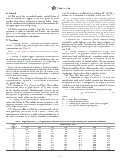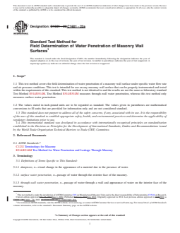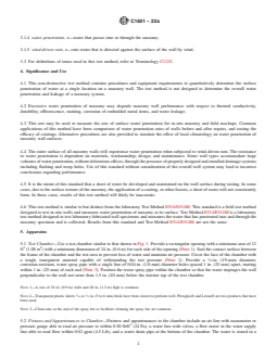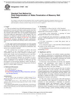 SIGNIFICANCE AND USE 4.1 This non-destructive test method contains procedures and equipment requirements to quantitatively determine the surface penetration of water at a single location on a masonry wall. The test method is not designed to determine the overall water penetration and leakage of a masonry system. 4.2 Excessive water penetration of masonry may degrade masonry wall performance with respect to thermal conductivity, durability, efflorescence, staining, corrosion of embedded metal items, and water leakage. 4.3 This test may be used to measure the rate of surface water penetration for in-situ masonry and field mockups. Common applications of this method have been comparison of water penetration rates of walls before and after repairs, and testing the efficacy of coatings. Alternative procedures are also provided to simulate the effect of local climatology on water penetration of masonry wall surfaces. 4.4 The outer surface of all masonry walls will experience water penetration when subjected to wind-driven rain. The resistance to water penetration is dependent on materials, workmanship, design, and maintenance. Some wall types accommodate large volumes of water penetration, without deleterious effects, through the presence of properly designed and installed drainage systems including flashing and weep holes. Use of this standard without consideration of the overall wall system may lead to incorrect conclusions regarding performance. 4.5 It is the intent of this standard that a sheet of water be developed and maintained on the wall surface during testing. In some cases, due to the surface texture of the masonry, the application of a coating, or other factors, a sheet of water will not consistently form. In those cases, results of this test method will likely be inaccurate. 4.6 This test method is similar to but distinct from the laboratory Test Method E514/E514M. This standard is a field test method designed to test in-situ walls and measures water penetration of... SCOPE 1.1 This test method covers the field determination of water penetration of a masonry wall surface under specific water flow rate and air pressure conditions. This test is intended for use on any masonry wall surface that can be properly instrumented and tested within the requirements of this standard. This test method is not identical to and the results are not the same as laboratory standard Test Method E514/E514M. Test Method E514/E514M measures through-wall water penetration, whereas this test method only measures surface water penetration. 1.2 The values stated in inch-pound units are to be regarded as standard. The values given in parentheses are mathematical conversions to SI units that are provided for information only and are not considered standard. 1.3 This standard does not purport to address all of the safety concerns, if any, associated with its use. It is the responsibility of the user of this standard to establish appropriate safety, health, and environmental practices and determine the applicability of regulatory limitations prior to use. 1.4 This international standard was developed in accordance with internationally recognized principles on standardization established in the Decision on Principles for the Development of International Standards, Guides and Recommendations issued by the World Trade Organization Technical Barriers to Trade (TBT) Committee.