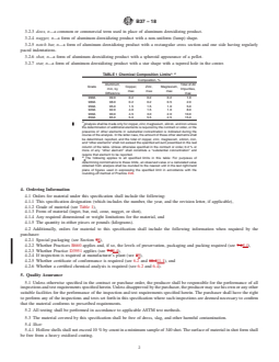ASTM B37-18 is a technical specification published by ASTM International. Its full title is "Standard Specification for Aluminum for Use in Iron and Steel Manufacture". This standard covers: ABSTRACT This specification covers the standard for ingot, bar, rod, cone, nugget or shot aluminum and aluminum alloys proposed for use in manufacturing iron and steel. Each sample shall conform to the chemical composition limits enlisted herein. Test samples can be taken at the time the ingots, bars, rods, cones, nuggets or shots are produced or from the finished product. SCOPE 1.1 This specification covers aluminum-alloy deoxidizing products of all compositions in the form of ingots, bars, rods, cones, nuggets, shot, or stars, for use in the manufacture of iron and steel. Six of the most commonly used deoxidizing product compositions are designated as shown in Table 1. (A) Analysis shall be made only for copper, zinc, magnesium, silicon, and iron unless the determination of additional elements is required by the contract or order, or the presence of other elements in substantial concentration is indicated during the course of the analysis. In the latter case, the amount of these other elements shall be determined, reported, and the total of copper, zinc, magnesium, silicon, iron, and “other elements” shall not exceed the specified amount prescribed in the last column of the table. Unless otherwise specified in the contract or order, 0.2 % or more of any “other element” shall constitute a “substantial concentration” and require that element to be reported.(B) The following applies to all specified limits in this table: For purposes of determining conformance to these limits, an observed value or a calculated value obtained from analysis shall be rounded to the nearest unit in the last right-hand place of figures used in expressing the specified limit in accordance with the rounding-off method of Practice E29. 1.2 Units—The values stated in inch-pound units are to be regarded as standard. The values given in parentheses are mathematical conversions to SI units that are provided for information only and are not considered standard. 1.3 This standard does not purport to address all of the safety concerns, if any, associated with its use. It is the responsibility of the user of this standard to establish appropriate safety, health, and environmental practices and determine the applicability of regulatory limitations prior to use. 1.4 This international standard was developed in accordance with internationally recognized principles on standardization established in the Decision on Principles for the Development of International Standards, Guides and Recommendations issued by the World Trade Organization Technical Barriers to Trade (TBT) Committee.