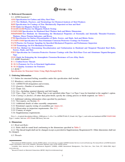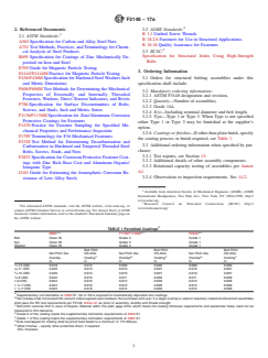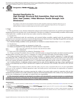 ABSTRACT This specification defines chemical, dimensional, physical and mechanical requirements for quenched and tempered bolts manufactured from steel and alloy steel, in inch dimensions. Structural bolting assemblies are designated as Grade 144. Bolts are designated by type denoting raw material chemical composition: Type 1 (144ksi - carbon steel, carbon boron steel, alloy steel or alloy steel with boron addition) and Type 3 (144ksi - weathering steel). Bolts manufactured under this specification, and structural bolting assemblies supplied under this specification, are intended for use in structural connections covered in the Specification for Structural Joints Using High-Strength Bolts and installed using the torque-and-angle or part turn/combined installation method. This specification covers materials and manufacturing practice requirements; permitted coatings; dimensions, threads, marking, and matching components; chemical and mechanical properties; testing and lot control; workmanship; quality assurance; and product marking. Products shall undergo tensile strength, proof load, surface discontinuities, hardness, micro-hardness, carburization/decarburization, coating thickness, magnetic particle, rotational capacity, and assembly tension testing. SCOPE 1.1 This specification covers chemical, dimensional, physical and mechanical requirements for quenched and tempered bolts manufactured from steel and alloy steel, in inch dimensions. The bolts are available as structural bolting assemblies which include a fixed spline bolt, a suitable nut and at least one washer covered by reference herein. 1.2 Intended Use: 1.2.1 Bolts manufactured under this specification, and structural bolting assemblies supplied under this specification, are intended for use in structural connections covered in the Specification for Structural Joints Using High-Strength Bolts and installed using the torque-and-angle or part turn/combined installation method. 1.2.2 Structural bolting assemblies in this specification are furnished in nominal diameters from 1/2 to 1-1/4 in. inclusive. 1.3 Classification: 1.3.1 Structural bolting assemblies are designated as Grade 144. 1.3.2 Bolts are designated by type denoting raw material chemical composition. Type 1 - 144ksi - carbon steel, carbon boron steel, alloy steel or alloy steel with boron addition Type 3 - 144ksi - weathering steel 1.4 Terms used in the specification are defined in Terminology F1789. 1.4.1 Torque-and-Angle Fixed-Spline Structural Bolt—bolt that includes an integral fixed-spline end which extends beyond the threaded portion of the bolt and is used as a component of a torque-and-angle fixed-spline structural bolting assembly. 1.4.2 Torque-and-Angle Fixed-Spline Structural Bolting Assembly2— a fastener assembly comprised of a torque-and-angle fixed-spline bolt with a suitable nut and at least one washer, installed and tightened using a special electric wrench and socket system which has an inner socket that engages the fixed-spline end of the bolt and with an outer socket that engages and turns the nut, in two separate and distinct operations, the first is a controlled torque application and the second is a specified angle. 1.4.3 Combined Method—A tightening method comprised of two steps, the first tightening step using a torque regulating tool and the second tightening step in which a specified turn is applied to the turned part of the assembly. Also known as the ‘part turn method’. 1.5 This standard does not purport to address all of the safety concerns, if any, associated with its use. It is the responsibility of the user of this standard to establish appropriate safety and health practices and determine the applicability of regulatory limitations prior to use. 1.6 ASTM International takes no position respecting the validity of any patent rights asserted in connection with any item mentioned in this standard. Users of this ...