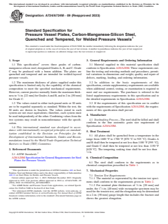 ASTM A724/A724M-09(2023) is a technical specification published by ASTM International. Its full title is "Standard Specification for Pressure Vessel Plates, Carbon-Manganese-Silicon Steel, Quenched and Tempered, for Welded Pressure Vessels". This standard covers: ABSTRACT This specification covers standard requirements for three grades of carbon-manganese-silicon steel, designated Grades A, B, and C. Grade C may be produced with a boron addition. The plates shall be quenched and tempered and shall be intended for welded-layered pressure vessels. The steel shall be killed and shall conform to the fine austenitic grain size requirement. Heat and product analyses shall be performed wherein the material shall conform to the required chemical composition for carbon, manganese, phosphorus, sulfur, silicon, copper, nickel, chromium, molybdenum, vanadium, and boron. The steel plate shall undergo tension test and shall conform to tensile requirements such as tensile strength, yield strength, and elongation. SCOPE 1.1 This specification2 covers three grades of carbon-manganese-silicon steel, designated Grades A, B, and C. Grade C may be produced with a boron addition. The plates are quenched and tempered and are intended for welded-layered pressure vessels. 1.2 The maximum thickness of plates supplied under this specification is limited only by the capability of the chemical composition to meet the specified mechanical requirements. However, current practice normally limits the maximum thickness to 7/8 in. [22 mm] for Grades A and B, and to 2 in. [50 mm] for Grade C. 1.3 The values stated in either inch-pound units or SI units are to be regarded separately as standard. Within the text, the SI units are shown in brackets. The values stated in each system are not exact equivalents; therefore, each system must be used independently of the other. Combining values from the two systems may result in nonconformance with the specification. 1.4 This international standard was developed in accordance with internationally recognized principles on standardization established in the Decision on Principles for the Development of International Standards, Guides and Recommendations issued by the World Trade Organization Technical Barriers to Trade (TBT) Committee.