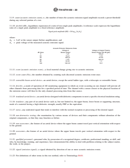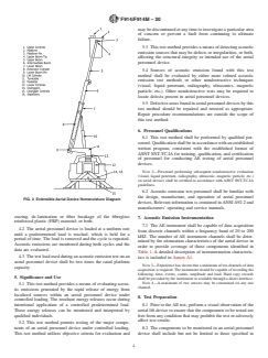 SIGNIFICANCE AND USE 5.1 This test method provides a means of evaluating acoustic emissions generated by the rapid release of energy from localized sources within an aerial personnel device under controlled loading. The resultant energy releases occur during intentional application of a controlled predetermined load. These energy releases can be monitored and interpreted by qualified individuals. 5.2 This test method permits testing of the major components of an aerial personnel device under controlled loading. This test method utilizes objective criteria for evaluation and may be discontinued at any time to investigate a particular area of concern or prevent a fault from continuing to ultimate failure. 5.3 This test method provides a means of detecting acoustic emission sources that may be defects or irregularities, or both, affecting the structural integrity or intended use of the aerial personnel device. 5.4 Sources of acoustic emission found with this test method shall be evaluated by either more refined acoustic emission test methods or other nondestructive techniques (visual, liquid penetrant, radiography, ultrasonics, magnetic particle, etc.). Other nondestructive tests may be required to locate defects present in aerial personnel devices. 5.5 Defective areas found in aerial personnel devices by this test method should be repaired and retested as appropriate. Repair procedure recommendations are outside the scope of this test method. SCOPE 1.1 This test method describes a procedure for non-destructive testing using acoustic emission (AE) testing for aerial personnel devices, which do not have a supplemental load handling attachment. 1.1.1 Equipment Covered—This test method covers the following types of vehicle-mounted insulated aerial personnel devices: 1.1.1.1 Extensible boom aerial personnel devices, 1.1.1.2 Articulating boom aerial personnel devices, and 1.1.1.3 Any combination of 1.1.1.1 and 1.1.1.2. 1.1.2 Equipment Not Covered—This test method does not cover any of the following equipment: 1.1.2.1 Material-handling aerial devices, 1.1.2.2 Digger-derricks with platform, and 1.1.2.3 Cranes with platform. 1.2 The AE test method is used to detect and area-locate emission sources. Verification of emission sources may require the use of other nondestructive test (NDT) methods, such as radiography, ultrasonics, magnetic particle, liquid penetrant, and visual inspection. Warning—This test method requires that external loads be applied to the superstructure of the vehicle under test. During the test, caution must be taken to safeguard personnel and equipment against unexpected failure or instability of the vehicle or components. Note 1: This test method is not intended to be a stand alone NDT method for the verification of the structural integrity of an aerial device. Other NDT methods should be used to supplement the results. 1.3 The values stated in either SI units or inch-pound units are to be regarded separately as standard. The values stated in each system are not necessarily exact equivalents; therefore, to ensure conformance with the standard, each system shall be used independently of the other, and values from the two systems shall not be combined. 1.4 This standard does not purport to address all of the safety concerns, if any, associated with its use. It is the responsibility of the user of this standard to establish appropriate safety, health, and environmental practices and determine the applicability of regulatory limitations prior to use. 1.5 This international standard was developed in accordance with internationally recognized principles on standardization established in the Decision on Principles for the Development of International Standards, Guides and Recommendations issued by the World Trade Organization Technical Barriers to Trade (TBT) Committee.