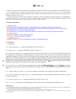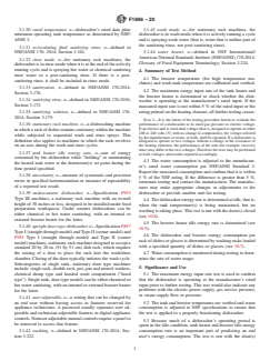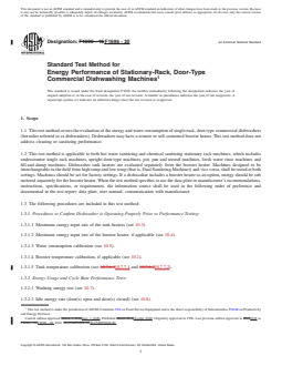 SIGNIFICANCE AND USE 5.1 The maximum energy input rate test is used to confirm that the dishwasher is operating at the manufacturer's rated input prior to further testing. This test would also indicate any problems with the electric power supply, gas service pressure, or steam supply flow or pressure. 5.2 The tank and booster temperature are verified and water consumption is adjusted to NSF specifications to ensure that the test is applied to a properly functioning dishwasher. 5.3 Because much of a dishwasher's operating period is spent in the idle condition, tank heater and booster idle energy consumption rate is an important part of predicting an end user's energy consumption. The test is run with the door(s) open and with the door(s) closed, so that the energy use of both end-user behaviors can be characterized. 5.4 A washing energy test generates an energy per rack usage. This is useful both as a measure for comparing the energy performance of one dishwasher to another and as a predictor of an end users energy consumption. 5.5 Water-consumption characterization is useful for estimating water and sewage costs associated with dishwashing machine operation. SCOPE 1.1 This test method covers the evaluation of the energy and water consumption of single-rack, door-type commercial dishwashers (hereafter referred to as dishwashers). Dishwashers may have a remote or self-contained booster heater. This test method does not address cleaning or sanitizing performance. 1.2 This test method is applicable to both hot water sanitizing and chemical sanitizing stationary rack machines, which includes undercounter single rack machines, upright door-type machines, pot, pan and utensil machines, fresh water rinse machines and fill-and-dump machines. Dishwasher tank heaters are evaluated separately from the booster heater. Machines designed to be interchangeable in the field from high temp and low temp (that is, Dual Sanitizing Machines) and vice versa, shall be tested at both settings. Machines should be set for factory settings. If a dishwasher includes a booster heater as an option, energy should be sub metered separately for the booster heater. When the test method specifies to use the data plate or manufacturer’s recommendations, instructions, specifications, or requirements, the information source shall be used in the following order of preference and documented in the test report: data plate, user manual, communication with manufacturer. 1.3 The following procedures are included in this test method: 1.3.1 Procedures to Confirm Dishwasher is Operating Properly Prior to Performance Testing: 1.3.1.1 Maximum energy input rate of the tank heaters (see 10.3). 1.3.1.2 Maximum energy input rate of the booster heater, if applicable (see 10.4). 1.3.1.3 Water consumption calibration (see 10.5). 1.3.1.4 Booster temperature calibration, if applicable (see 10.2). 1.3.1.5 Tank temperature calibration (see 10.7.7.1 and 10.7.7.2). 1.3.2 Energy Usage and Cycle Rate Performance Tests: 1.3.2.1 Washing energy test (see 10.7). 1.3.2.2 Idle energy rate (door(s) open and door(s) closed) (see 10.8). 1.4 The values stated in inch-pound units are to be regarded as standard. The SI units given in parentheses are for information only. 1.5 This standard does not purport to address all of the safety concerns, if any, associated with its use. It is the responsibility of the user of this standard to establish appropriate safety, health, and environmental practices and determine the applicability of regulatory limitations prior to use. 1.6 This international standard was developed in accordance with internationally recognized principles on standardization established in the Decision on Principles for the Development of International Standards, Guides and Recommendations issued by the World Trade Organization Technical Barriers to Trade (TBT) Committee.