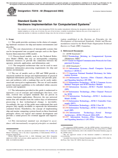 ASTM F2218-02(2022) is a guide published by ASTM International. Its full title is "Standard Guide for Hardware Implementation for Computerized Systems". This standard covers: SIGNIFICANCE AND USE 3.1 This guide is aimed at providing a general understanding of the various types of hardware devices that form the core of information processing systems for ship and marine use. Ship and marine information processing systems require specific devices in order to perform automated tasks in a specialized environment. In addition to providing information services for each individual installation, these devices are often networked and are capable of supplementary functions that benefits ship and marine operations. 3.2 A variety of choices exists for deployment of information processing devices and greatly increases the complexity of the selection task for ship and marine systems. The choice of a particular device or system cannot be made solely on the singular requirements of one application or function. Modern information processing systems are usually installed in a complex environment where systems must be made to interact with each other. Ship and marine installations add an even further layer of complexity to the process of choosing adequate computerized systems. This guide aims to alleviate this task by giving users specific choices that are proven technologies that perform in a complex environment. 3.3 Hardware resources used in ship and marine installations are a result of careful consideration of utility and function. These resources may require some physical specialization in order to inhabit a particular environment, but they are in no way different from equipment used in shore-based situations. Ship and marine computer system configurations, interconnections, and support services are essentially the same as those found in a land-based network environment and as a result, the skill sets of ship and marine information processing system users, administrators, and support personnel are interchangeable with those of shore-based activities. SCOPE 1.1 This guide provides assistance in the choice of computing hardware resources for ship and marine environments and describes: 1.1.1 The core characteristics of interoperable systems that can be incorporated into accepted concepts such as the Open System Interconnection (OSI) model; 1.1.2 Process-based models, such as the Technical Reference Model (TRM), that rely on interoperable computing hardware resources to provide the connection between the operator, network, application, and information; and, 1.1.3 The integrated architecture that can be used to meet minimum information processing requirements for ship and marine environments. 1.2 The use of models such as OSI and TRM provide a structured method for design and implementation of practical shipboard information processing systems and provides planners and architects with a roadmap that can be easily understood and conveyed to implementers. The use of such models permit functional capabilities to be embodied within concrete systems and equipment. 1.3 The information provided in this guide is understood to represent a set of concepts and technologies that have, over time, evolved into accepted standards that are proven in various functional applications. However, the one universal notion that still remains from the earliest days of information processing is that technological change is inevitable. Accordingly, the user of this guide must understand that such progress may rapidly invalidate or supersede the information contained herein. Nonetheless, the concept of implementing ship and marine computing systems based on these functional principles allows for logical and rational development and provides a sound process for eventual upgrade and improvement. 1.4 This international standard was developed in accordance with internationally recognized principles on standardization established in the Decision on Principles for the Development of International Standards, Guides and Recommendations issued by the World Trade Organization Technical Barriers to Trade (TBT) Committee.