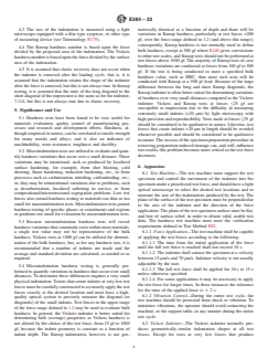 5.4 Microindentation hardness testing is generally performed to quantify variations in hardness that occur over small distances. To determine these differences requires a very small physical indentation. Testers that create indents at very low test forces must be carefully constructed to accurately apply the test forces exactly at the desired location and must have a high-quality optical syste...