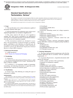 ASTM F2046-00(2022), Standard Specification for Tachometers, Various defines requirements for a wide range of tachometers used to measure rotational shaft speed. This international ASTM standard applies to diverse tachometer types, including those used for critical naval shipboard applications, and guides the selection of materials, performance requirements, testing, and documentation. The specification covers both electric and fiber-optic tachometers, ensuring long-term compatibility, reliability, and environmental resilience, essential in industrial, marine, and military environments.