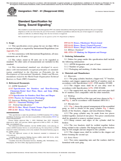 ASTM F957-91(2023): Standard Specification for Gong, Sound Signaling sets forth the requirements for gongs used as sound signal devices aboard ships of 100 meters or more in length, as mandated by international maritime regulations. This standard, developed and maintained by ASTM International, ensures that vessel gongs are constructed, tested, and marked in accordance with internationally recognized principles and technical criteria. It plays a critical role in helping shipbuilders, naval architects, and marine equipment suppliers ensure their products meet safety requirements for maritime navigation.
