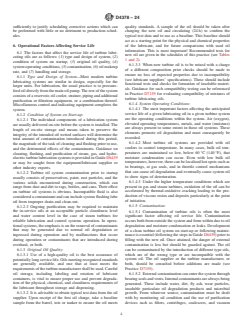 SIGNIFICANCE AND USE 4.1 This practice is intended to assist the user, in particular the power-plant operations and maintenance departments, to maintain effective lubrication of all parts of the turbine and guard against the onset of problems associated with oil degradation and contamination. The values of the various test parameters mentioned in this practice are purely indicative. In fact, for proper interpretation of the results, many factors, such as type of equipment, operation workload, design of the lubricating oil circuit, and top-up level, should be taken into account. SCOPE 1.1 This practice covers the requirements for the effective monitoring of mineral turbine oils in service in steam and gas turbines, as individual or combined cycle turbines, used for power generation. This practice includes sampling and testing schedules to validate the condition of the lubricant through its life cycle and by ensuring required improvements to bring the present condition of the lubricant within the acceptable targets. This practice is not intended for condition monitoring of lubricants for auxiliary equipment; it is recommended that the appropriate practice be consulted (see Practice D6224). 1.2 This standard does not purport to address all of the safety concerns, if any, associated with its use. It is the responsibility of the user of this standard to establish appropriate safety, health, and environmental practices and determine the applicability of regulatory limitations prior to use. 1.3 This international standard was developed in accordance with internationally recognized principles on standardization established in the Decision on Principles for the Development of International Standards, Guides and Recommendations issued by the World Trade Organization Technical Barriers to Trade (TBT) Committee.