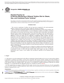 ASTM D4378-24 is a standard published by ASTM International. Its full title is "Standard Practice for In-Service Monitoring of Mineral Turbine Oils for Steam, Gas, and Combined Cycle Turbines". This standard covers: SIGNIFICANCE AND USE 4.1 This practice is intended to assist the user, in particular the power-plant operations and maintenance departments, to maintain effective lubrication of all parts of the turbine and guard against the onset of problems associated with oil degradation and contamination. The values of the various test parameters mentioned in this practice are purely indicative. In fact, for proper interpretation of the results, many factors, such as type of equipment, operation workload, design of the lubricating oil circuit, and top-up level, should be taken into account. SCOPE 1.1 This practice covers the requirements for the effective monitoring of mineral turbine oils in service in steam and gas turbines, as individual or combined cycle turbines, used for power generation. This practice includes sampling and testing schedules to validate the condition of the lubricant through its life cycle and by ensuring required improvements to bring the present condition of the lubricant within the acceptable targets. This practice is not intended for condition monitoring of lubricants for auxiliary equipment; it is recommended that the appropriate practice be consulted (see Practice D6224). 1.2 This standard does not purport to address all of the safety concerns, if any, associated with its use. It is the responsibility of the user of this standard to establish appropriate safety, health, and environmental practices and determine the applicability of regulatory limitations prior to use. 1.3 This international standard was developed in accordance with internationally recognized principles on standardization established in the Decision on Principles for the Development of International Standards, Guides and Recommendations issued by the World Trade Organization Technical Barriers to Trade (TBT) Committee.
