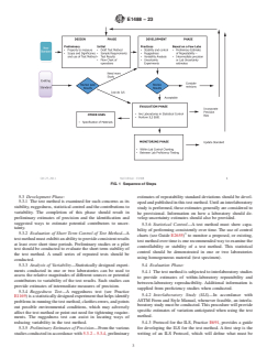4.2 This standard introduces a series of phases which are recommended to be considered during the life cycle of a test method as depicted in Fig. 1. These begin with a design phase where the standard is initially prepared. A development phase involves a variety of experiments that allow further refinement and understanding of how the test method performs within a laboratory. In an evaluation phase the test method is then examined by way of interlaboratory studies resulting in precision and bias statistics which are published in the standard. Finally, the test method is subject to a monitoring phase.