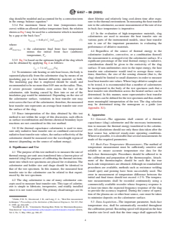 4.4 Regardless of the source of thermal energy to the calorimeter (radiative, convective, or a combination thereof) the measurement is averaged over the calorimeter surface. If a significant percentage of the total thermal energy is radiative, consideration should be given to the emissivity of the slug surface. If non-uniformities exist in the input energy, the heat transfer rate calorimeter would tend to average these variations; therefore, the size of the sensing element (that is, the slug) should be limited to small diameters in order to measure local heat transfer rate values. Where large ablative samples are to be tested, it is recommended that a number of calorimeters be incorporated in the body of the test specimen such that a heat transfer rate distribution across...