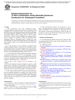 ASTM B786/B786M-08(2023) is a technical specification published by ASTM International. Its full title is "Standard Specification for 19 Wire Combination Unilay-Stranded Aluminum Conductors for Subsequent Insulation". This standard covers: ABSTRACT This specification covers the standard requirements for bare combination unilay-stranded conductors made from round wires of aluminum 1350 and 8000 series of aluminum alloys, for insulated conductors to be used for electrical purposes. Aluminum 1350 wires in tempers -H19, -H16 or -H26, -H14 or -H24, and -H142 or -H242 and 8000 series aluminum alloy wires in tempers “0” and H1X or H2X are permitted. These conductors shall be constructed with a central core wire surrounded by two layers of helically laid wires, resulting in an outer diameter equal to the compressed-stranded equivalent conductors. Electric-butt welds, cold pressure welds, or electric-butt cold-upset welds may be made in the finished individual wires composing the conductor. Mechanical (tension) and electrical tests shall be performed on the wires composing the conductors that are annealed and not annealed after stranding. The mass and electrical resistance of a unit length of stranded conductor shall be determined as a function of the length of lay. The conductors shall meet the breaking strength, tensile strength, and bending strength requirements. SCOPE 1.1 This specification covers bare combination unilay-stranded conductors made from round wires of aluminum 1350 and 8000 series of aluminum alloys, for insulated conductors for electrical purposes. Aluminum 1350 wires in tempers -H19 (extra hard), -H16 or -H26 (3/4 hard), -H14 or -H24 (1/2 hard), and -H142 or -H242 (1/2 hard) and 8000 series aluminum alloys wires in tempers “0” and H1X or H2X are permitted. These conductors shall be constructed with a central core wire surrounded by two layers of helically laid wires, resulting in an outer diameter equal to the compressed-stranded equivalent conductors. Note 1: For the purpose of this specification, combination unilay conductor is defined as follows: a central core wire surrounded by a layer of six helically laid wires of the same diameter as the core wire with a helically laid outer layer containing six smaller wires alternated between six wires of the same diameter as the wires in the layer underneath. Both layers have a common length and direction of lay (see Fig. 1). FIG. 1 Cross Section of Conductor 1.1.1 For the purpose of this specification, normal conductor classification (Class AA, A, B, C) is not applicable, as these conductors are intended for subsequent insulation. The descriptive term combination unilay-stranded shall be used in place of conductor classification (Note 2 and Note 3). Note 2: Prior to 1975, aluminum 1350 was designated as EC aluminum. Note 3: The aluminum and temper designations conform to ANSI Standard H35.1. Aluminum 1350 corresponds to Unified Numbering System A91350 in accordance with Practice E527. Unified Numbering System alloy designations for 8000 Series aluminum alloys in accordance with Practice E527 are listed in Table number 1 of Specification B800. 1.2 The values stated in either SI units or inch-pound units are to be regarded separately as standard. The values stated in each system may not be exact equivalents; therefore, each system shall be used independently of the other. Combining values from the two systems may result in non-conformance with the standard. 1.3 This international standard was developed in accordance with internationally recognized principles on standardization established in the Decision on Principles for the Development of International Standards, Guides and Recommendations issued by the World Trade Organization Technical Barriers to Trade (TBT) Committee.