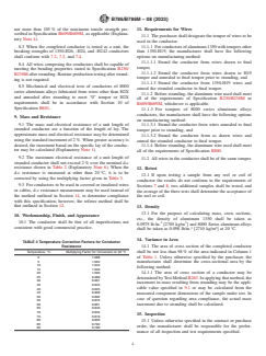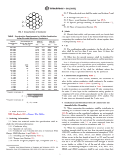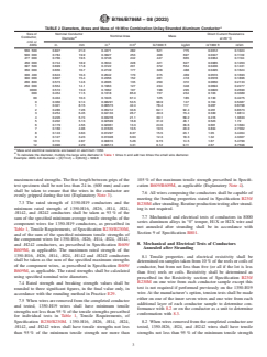 ABSTRACT This specification covers the standard requirements for bare combination unilay-stranded conductors made from round wires of aluminum 1350 and 8000 series of aluminum alloys, for insulated conductors to be used for electrical purposes. Aluminum 1350 wires in tempers -H19, -H16 or -H26, -H14 or -H24, and -H142 or -H242 and 8000 series aluminum alloy wires in tempers “0” and H1X or H2X are permitted. These conductors shall be constructed with a central core wire surrounded by two layers of helically laid wires, resulting in an outer diameter equal to the compressed-stranded equivalent conductors. Electric-butt welds, cold pressure welds, or electric-butt cold-upset welds may be made in the finished individual wires composing the conductor. Mechanical (tension) and electrical tests shall be performed on the wires composing the conductors that are annealed and not annealed after stranding. The mass and electrical resistance of a unit length of stranded conductor shall be determined as a function of the length of lay. The conductors shall meet the breaking strength, tensile strength, and bending strength requirements. SCOPE 1.1 This specification covers bare combination unilay-stranded conductors made from round wires of aluminum 1350 and 8000 series of aluminum alloys, for insulated conductors for electrical purposes. Aluminum 1350 wires in tempers -H19 (extra hard), -H16 or -H26 (3/4 hard), -H14 or -H24 (1/2 hard), and -H142 or -H242 (1/2 hard) and 8000 series aluminum alloys wires in tempers “0” and H1X or H2X are permitted. These conductors shall be constructed with a central core wire surrounded by two layers of helically laid wires, resulting in an outer diameter equal to the compressed-stranded equivalent conductors. Note 1: For the purpose of this specification, combination unilay conductor is defined as follows: a central core wire surrounded by a layer of six helically laid wires of the same diameter as the core wire with a helically laid outer layer containing six smaller wires alternated between six wires of the same diameter as the wires in the layer underneath. Both layers have a common length and direction of lay (see Fig. 1). FIG. 1 Cross Section of Conductor 1.1.1 For the purpose of this specification, normal conductor classification (Class AA, A, B, C) is not applicable, as these conductors are intended for subsequent insulation. The descriptive term combination unilay-stranded shall be used in place of conductor classification (Note 2 and Note 3). Note 2: Prior to 1975, aluminum 1350 was designated as EC aluminum. Note 3: The aluminum and temper designations conform to ANSI Standard H35.1. Aluminum 1350 corresponds to Unified Numbering System A91350 in accordance with Practice E527. Unified Numbering System alloy designations for 8000 Series aluminum alloys in accordance with Practice E527 are listed in Table number 1 of Specification B800. 1.2 The values stated in either SI units or inch-pound units are to be regarded separately as standard. The values stated in each system may not be exact equivalents; therefore, each system shall be used independently of the other. Combining values from the two systems may result in non-conformance with the standard. 1.3 This international standard was developed in accordance with internationally recognized principles on standardization established in the Decision on Principles for the Development of International Standards, Guides and Recommendations issued by the World Trade Organization Technical Barriers to Trade (TBT) Committee.