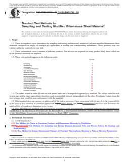 1.1 These test methods cover procedures for sampling and testing prefabricated, reinforced, polymer-modified bituminous sheet materials designed for single- or multiple-ply application in roofing and waterproofing membranes. These products may use various surfacing materials on one side.