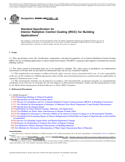 SCOPE 1.1 This specification covers the classification, composition, and physical properties of an Interior Radiation Control Coating (IRCC) for use in building applications to reduce radiant heat transfer. The IRCC is sprayed, roller applied, or brushed onto interior building surfaces. 1.2 The values stated in inch-pound units are to be regarded as standard. The values given in parentheses are mathematical conversions to SI units that are provided for information only and are not considered standard. 1.3 This standard does not purport to address all of the safety concerns, if any, associated with its use. It is the responsibility of the user of this standard to establish appropriate safety, health, and environmental practices and determine the applicability of regulatory limitations prior to use. 1.4 This international standard was developed in accordance with internationally recognized principles on standardization established in the Decision on Principles for the Development of International Standards, Guides and Recommendations issued by the World Trade Organization Technical Barriers to Trade (TBT) Committee.