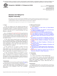 ASTM D88/D88M-07(2024) is a standard published by ASTM International. Its full title is "Standard Test Method for Saybolt Viscosity". This standard covers: SIGNIFICANCE AND USE 5.1 This test method is useful in characterizing certain petroleum products, as one element in establishing uniformity of shipments and sources of supply. 5.2 See Guide D117 for applicability to mineral oils used as electrical insulating oils. 5.3 The Saybolt Furol viscosity is approximately one tenth the Saybolt Universal viscosity, and is recommended for characterization of petroleum products such as fuel oils and other residual materials having Saybolt Universal viscosities greater than 1000 s. 5.4 Determination of the Saybolt Furol viscosity of bituminous materials at higher temperatures is covered by Test Method E102/E102M. SCOPE 1.1 This test method covers the empirical procedures for determining the Saybolt Universal or Saybolt Furol viscosities of petroleum products at specified temperatures between 21 and 99 °C [70 and 210 °F]. A special procedure for waxy products is indicated. Note 1: Test Methods D445 and D2170/D2170M are preferred for the determination of kinematic viscosity. They require smaller samples and less time, and provide greater accuracy. Kinematic viscosities may be converted to Saybolt viscosities by use of the tables in Practice D2161. It is recommended that viscosity indexes be calculated from kinematic rather than Saybolt viscosities. 1.2 The values stated in either SI units or inch-pound units are to be regarded separately as standard. The values stated in each system are not necessarily exact equivalents; therefore, to ensure conformance with the standard, each system shall be used independently of the other, and values from the two systems shall not be combined. 1.3 This standard does not purport to address all of the safety concerns, if any, associated with its use. It is the responsibility of the user of this standard to establish appropriate safety, health, and environmental practices and determine the applicability of regulatory limitations prior to use. 1.4 This international standard was developed in accordance with internationally recognized principles on standardization established in the Decision on Principles for the Development of International Standards, Guides and Recommendations issued by the World Trade Organization Technical Barriers to Trade (TBT) Committee.