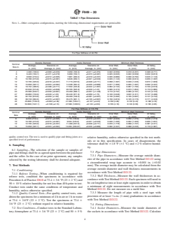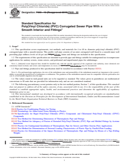ABSTRACT This specification covers the requirements, test methods, and materials for 4 to 36-in. diameter poly(vinyl chloride) (PVC) corrugated pipes, joints, and fittings that consist of an outer corrugated wall fused to a smooth inner wall, and are suitable for underground use in nonpressure applications for sanitary sewers, storm sewers, and perforated and unperforated pipes for subdrainage. When evaluated by the test procedures enumerated herein, the products shall conform to dimensional and performance requirements as specified for pipe stiffness, flattening resistance, impact strength, extrusion quality, heat reversion, bond strength, and joint tightness. SCOPE 1.1 This specification covers requirements, test methods, and materials for 4 to 48 in. diameter poly(vinyl chloride) (PVC) corrugated pipe with a smooth interior. This profile wall pipe consists of an outer corrugated wall fused to a smooth inner wall providing pipe stiffness levels of 46 psi and 115 psi. Joints and fittings are included in this specification. 1.2 The requirements of this specification are intended to provide pipe and fittings suitable for underground use in nonpressure applications for sanitary sewers, storm sewers, and perforated and unperforated pipes for subdrainage. Note 1: Industrial waste disposal lines should be installed only with the specific approval of the cognizant code authority, since chemicals not commonly found in drains and sewers and temperatures in excess of 140 °F (60 °C) may be encountered. 1.3 Pipe and fittings produced to this specification shall be installed in accordance with Practice D2321. Note 2: For perforated pipe applications, the size of the embedment zone and permeability of the embedment material are important to the system's ability to provide the desired level of infiltration or exfiltration. The gradation of the embedment material must be compatible with the perforation slot size to avoid backfill migration into the pipe. 1.4 The values stated in inch-pound units are to be regarded as standard. The values given in parentheses are mathematical conversions to SI units that are provided for information only and are not considered standard. 1.5 The following precautionary caveat pertains only to the test method portion, Section 7, of this specification: This standard does not purport to address all of the safety concerns, if any, associated with its use. It is the responsibility of the user of this standard to establish appropriate safety, health, and environmental practices and determine the applicability of regulatory limitations prior to use. 1.6 This international standard was developed in accordance with internationally recognized principles on standardization established in the Decision on Principles for the Development of International Standards, Guides and Recommendations issued by the World Trade Organization Technical Barriers to Trade (TBT) Committee.