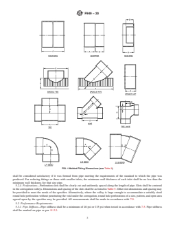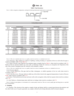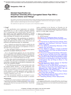 ASTM F949-20 is a technical specification published by ASTM International. Its full title is "Standard Specification for Poly(Vinyl Chloride) (PVC) Corrugated Sewer Pipe With a Smooth Interior and Fittings". This standard covers: ABSTRACT This specification covers the requirements, test methods, and materials for 4 to 36-in. diameter poly(vinyl chloride) (PVC) corrugated pipes, joints, and fittings that consist of an outer corrugated wall fused to a smooth inner wall, and are suitable for underground use in nonpressure applications for sanitary sewers, storm sewers, and perforated and unperforated pipes for subdrainage. When evaluated by the test procedures enumerated herein, the products shall conform to dimensional and performance requirements as specified for pipe stiffness, flattening resistance, impact strength, extrusion quality, heat reversion, bond strength, and joint tightness. SCOPE 1.1 This specification covers requirements, test methods, and materials for 4 to 48 in. diameter poly(vinyl chloride) (PVC) corrugated pipe with a smooth interior. This profile wall pipe consists of an outer corrugated wall fused to a smooth inner wall providing pipe stiffness levels of 46 psi and 115 psi. Joints and fittings are included in this specification. 1.2 The requirements of this specification are intended to provide pipe and fittings suitable for underground use in nonpressure applications for sanitary sewers, storm sewers, and perforated and unperforated pipes for subdrainage. Note 1: Industrial waste disposal lines should be installed only with the specific approval of the cognizant code authority, since chemicals not commonly found in drains and sewers and temperatures in excess of 140 °F (60 °C) may be encountered. 1.3 Pipe and fittings produced to this specification shall be installed in accordance with Practice D2321. Note 2: For perforated pipe applications, the size of the embedment zone and permeability of the embedment material are important to the system's ability to provide the desired level of infiltration or exfiltration. The gradation of the embedment material must be compatible with the perforation slot size to avoid backfill migration into the pipe. 1.4 The values stated in inch-pound units are to be regarded as standard. The values given in parentheses are mathematical conversions to SI units that are provided for information only and are not considered standard. 1.5 The following precautionary caveat pertains only to the test method portion, Section 7, of this specification: This standard does not purport to address all of the safety concerns, if any, associated with its use. It is the responsibility of the user of this standard to establish appropriate safety, health, and environmental practices and determine the applicability of regulatory limitations prior to use. 1.6 This international standard was developed in accordance with internationally recognized principles on standardization established in the Decision on Principles for the Development of International Standards, Guides and Recommendations issued by the World Trade Organization Technical Barriers to Trade (TBT) Committee.