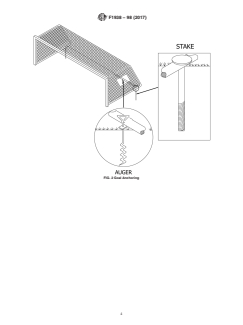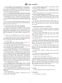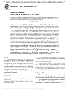 ASTM F1938-98(2017) is a guide published by ASTM International. Its full title is "Standard Guide for Safer Use of Movable Soccer Goals". This standard covers: ABSTRACT This guide presents directions for the installation, use, and storage of full-size or nearly full-size movable soccer goals. It is expected that these guidelines can help prevent deaths and serious injuries resulting from soccer goal tipover. These guidelines are intended for use by parks and recreation personnel, school officials, sports equipment purchasers, parents, coaches, and any other members of the general public concerned with soccer goal safety. These guidelines are intended to address the risk of movable soccer goal tipover. In designing soccer goal, the following may be considered: use of a counterbalancing strategy by lengthening the over all depth of the goal to effectively place more mass further from the goal's front posts, selection of light materials for the goal's front posts and crossbar and provides much heavier materials for the rear ground bar and frame members, use of a heavy rear framework and folds flat when not in use, making the goal much less likely to tip over. Securing soccer goals may be done in several ways. The number and type of anchors to be used will depend on a number of factors, such as types of playing surface, soil type, soil moisture content, and total goal weight. These anchor types shall include: Auger-Style Stake which is helical in shape and is screwed into the ground, Peg- or Stake-Style Stake which varies in lengths and diameters, J-Hook-Shaped-Stake Style which varies in lengths and diameters and its curved-top portion is designed to fit over goal members to secure it to the ground, and All-Stakes styles in which a minimum of two stakes must be used for each goal. Sandbags or other counterweights could be an effective alternative to anchors on hard surfaces, such as artificial turf, where the surface cannot be penetrated by a conventional anchor, that is, an indoor practice facility. Also a semipermanent anchor type may be used which is usually comprised of two or more functional components. The main support requires a permanently secured base that is buried underground. One type of semipermanent anchor connects the underground base to the soccer goal by means of two tethers. Another design utilizes a buried anchor tube with a threaded opening at ground level. Net pegs may be tapered, metal or plastic stakes, or both, and should only be used to secure the net to the ground. SCOPE 1.1 This guide presents directions for the installation, use, and storage of full-size or nearly full-size movable soccer goals. It is expected that these guidelines can help prevent deaths and serious injuries resulting from soccer goal tipover. 1.2 These guidelines are intended for use by parks and recreation personnel, school officials, sports equipment purchasers, parents, coaches, and any other members of the general public concerned with soccer goal safety. 1.3 These guidelines are intended to address the risk of movable soccer goal tipover. 1.4 The values stated in inch-pound units are to be regarded as standard. The values given in parentheses are mathematical conversions to SI units that are provided for information only and are not considered standard. 1.5 This international standard was developed in accordance with internationally recognized principles on standardization established in the Decision on Principles for the Development of International Standards, Guides and Recommendations issued by the World Trade Organization Technical Barriers to Trade (TBT) Committee.