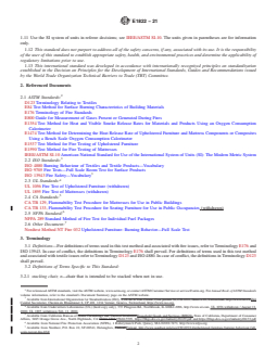 ASTM E1822-21 is a standard published by ASTM International. Its full title is "Standard Test Method for Fire Testing of Stacked Chairs". This standard covers: SIGNIFICANCE AND USE 5.1 This test method provides a means of measuring a variety of fire-test-response characteristics resulting from burning a stack of five stacking chairs. After ignition using a propane gas burner, the test specimen is permitted to burn freely under well-ventilated conditions. The most important fire-test-response characteristic measured in this test method is the rate of heat release, which quantifies the intensity of the fire generated. 5.2 The rate of heat release is measured by the principle of oxygen consumption. Annex A3 discusses the assumptions and limitations. 5.3 This test method also provides measures of other fire-test-response characteristics, including smoke obscuration (as the rate of smoke release, total smoke released or optical density of smoke), combustion gas release (as concentrations of combustion gases), and mass loss, that are important to making decisions on fire safety. 5.4 In the majority of fires, the most important gaseous components of smoke are the carbon oxides present in all fires. They are indicators of the toxicity of the atmosphere and of the completeness of combustion. Measurement of concentrations of carbon oxides are useful for two purposes: as part of fire hazard assessment calculations and to improve the accuracy of heat-release measurements. Other toxic combustion gases, which are specific to certain materials, are also indicators of the toxicity of the atmospheres, but are less crucial for determining combustion completeness and are optional measures; however fire hazard assessment often requires their measurement. 5.5 The type of ignition chosen (flaming source) is common in both accidental and intentional fires in public occupancies. This test method is thus applicable to stacked chairs in public occupancies. Such facilities include, but are not limited to, health-care facilities, old-age convalescent and board and care homes, college dormitories and residence halls, and hotels and motels. 5.6 One of the fo... SCOPE 1.1 This is a fire-test-response standard. 1.2 This test method provides a means of determining the burning behavior of stacking chairs used in public occupancies by measuring specific fire-test responses when a stack of chairs is subjected to a specified flaming ignition source under well ventilated conditions. 1.3 This test method is limited to stacked chairs. 1.4 Test data are obtained describing the burning behavior following application of a specific ignition source, from ignition until all burning has ceased, a period of one hour has elapsed, or flashover under test conditions appears inevitable. 1.5 This test method does not provide information on the fire performance of stacked chairs under fire conditions other than those conditions specified in this test method. In particular, this test method does not apply to smoldering ignition by cigarettes. See 5.11 for further information. 1.6 The rate of heat release of the burning test specimen is measured by an oxygen consumption method. See 5.11.4 for further information. 1.7 Other measurements are the production of light-obscuring smoke and the concentrations of certain toxic gas species in the combustion gases. See 5.11.5 for further information. 1.8 The burning behavior is documented visually by photographic or video recordings. 1.9 This standard is used to measure and describe the response of materials, products, or assemblies to heat and flame under controlled conditions, but does not by itself incorporate all factors required for fire hazard or fire risk assessment of the materials, products or assemblies under actual fire conditions. 1.10 Fire testing is inherently hazardous. Adequate safeguards for personnel and property shall be employed in conducting these tests. 1.11 Use the SI system of units in referee decisions; see IEEE/ASTM SI-10. The units given in parentheses are for information only. 1.12 This standard does not purpo...