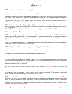 SIGNIFICANCE AND USE 5.1 This test method provides a means of measuring a variety of fire-test-response characteristics resulting from burning a stack of five stacking chairs. After ignition using a propane gas burner, the test specimen is permitted to burn freely under well-ventilated conditions. The most important fire-test-response characteristic measured in this test method is the rate of heat release, which quantifies the intensity of the fire generated. 5.2 The rate of heat release is measured by the principle of oxygen consumption. Annex A3 discusses the assumptions and limitations. 5.3 This test method also provides measures of other fire-test-response characteristics, including smoke obscuration (as the rate of smoke release, total smoke released or optical density of smoke), combustion gas release (as concentrations of combustion gases), and mass loss, that are important to making decisions on fire safety. 5.4 In the majority of fires, the most important gaseous components of smoke are the carbon oxides present in all fires. They are indicators of the toxicity of the atmosphere and of the completeness of combustion. Measurement of concentrations of carbon oxides are useful for two purposes: as part of fire hazard assessment calculations and to improve the accuracy of heat-release measurements. Other toxic combustion gases, which are specific to certain materials, are also indicators of the toxicity of the atmospheres, but are less crucial for determining combustion completeness and are optional measures; however fire hazard assessment often requires their measurement. 5.5 The type of ignition chosen (flaming source) is common in both accidental and intentional fires in public occupancies. This test method is thus applicable to stacked chairs in public occupancies. Such facilities include, but are not limited to, health-care facilities, old-age convalescent and board and care homes, college dormitories and residence halls, and hotels and motels. 5.6 One of the fo... SCOPE 1.1 This is a fire-test-response standard. 1.2 This test method provides a means of determining the burning behavior of stacking chairs used in public occupancies by measuring specific fire-test responses when a stack of chairs is subjected to a specified flaming ignition source under well ventilated conditions. 1.3 This test method is limited to stacked chairs. 1.4 Test data are obtained describing the burning behavior following application of a specific ignition source, from ignition until all burning has ceased, a period of one hour has elapsed, or flashover under test conditions appears inevitable. 1.5 This test method does not provide information on the fire performance of stacked chairs under fire conditions other than those conditions specified in this test method. In particular, this test method does not apply to smoldering ignition by cigarettes. See 5.11 for further information. 1.6 The rate of heat release of the burning test specimen is measured by an oxygen consumption method. See 5.11.4 for further information. 1.7 Other measurements are the production of light-obscuring smoke and the concentrations of certain toxic gas species in the combustion gases. See 5.11.5 for further information. 1.8 The burning behavior is documented visually by photographic or video recordings. 1.9 This standard is used to measure and describe the response of materials, products, or assemblies to heat and flame under controlled conditions, but does not by itself incorporate all factors required for fire hazard or fire risk assessment of the materials, products or assemblies under actual fire conditions. 1.10 Fire testing is inherently hazardous. Adequate safeguards for personnel and property shall be employed in conducting these tests. 1.11 Use the SI system of units in referee decisions; see IEEE/ASTM SI-10. The units given in parentheses are for information only. 1.12 This standard does not purpo...