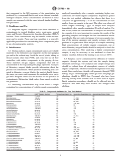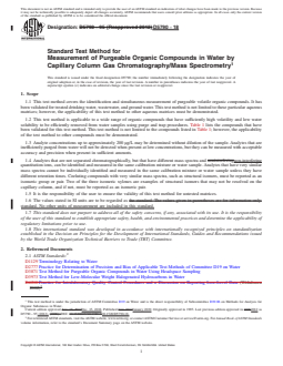 SIGNIFICANCE AND USE 5.1 Purgeable organic compounds have been identified as contaminants in treated drinking water, wastewater, ground water, and Toxicity Characteristic Leaching Procedure (TCLP) leachate. These contaminants may be harmful to the environment and to people. Purge and trap sampling is a generally applicable procedure for concentrating these components prior to gas chromatographic analysis. SCOPE 1.1 This test method covers the identification and simultaneous measurement of purgeable volatile organic compounds. It has been validated for treated drinking water, wastewater, and ground water. This test method is not limited to these particular aqueous matrices; however, the applicability of this test method to other aqueous matrices must be demonstrated. 1.2 This test method is applicable to a wide range of organic compounds that have sufficiently high volatility and low water solubility to be efficiently removed from water samples using purge and trap procedures. Table 1 lists the compounds that have been validated for this test method. This test method is not limited to the compounds listed in Table 1; however, the applicability of the test method to other compounds must be demonstrated. 1.3 Analyte concentrations up to approximately 200 μg/L may be determined without dilution of the sample. Analytes that are inefficiently purged from water will not be detected when present at low concentrations, but they can be measured with acceptable accuracy and precision when present in sufficient amounts. 1.4 Analytes that are not separated chromatographically, but that have different mass spectra and non-interfering quantitation ions, can be identified and measured in the same calibration mixture or water sample. Analytes that have very similar mass spectra cannot be individually identified and measured in the same calibration mixture or water sample unless they have different retention times. Coeluting compounds with very similar mass spectra, such as structural isomers, must be reported as an isomeric group or pair. Two of the three isomeric xylenes are examples of structural isomers that may not be resolved on the capillary column, and if not, must be reported as an isomeric pair. 1.5 It is the responsibility of the user to ensure the validity of this test method for untested matrices. 1.6 The values stated in SI units are to be regarded as standard. No other units of measurement are included in this standard. 1.7 This standard does not purport to address all of the safety concerns, if any, associated with its use. It is the responsibility of the user of this standard to establish appropriate safety, health, and environmental practices and determine the applicability of regulatory limitations prior to use. 1.8 This international standard was developed in accordance with internationally recognized principles on standardization established in the Decision on Principles for the Development of International Standards, Guides and Recommendations issued by the World Trade Organization Technical Barriers to Trade (TBT) Committee.
