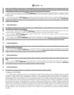 ASTM D5790-18 is a standard published by ASTM International. Its full title is "Standard Test Method for Measurement of Purgeable Organic Compounds in Water by Capillary Column Gas Chromatography/Mass Spectrometry". This standard covers: SIGNIFICANCE AND USE 5.1 Purgeable organic compounds have been identified as contaminants in treated drinking water, wastewater, ground water, and Toxicity Characteristic Leaching Procedure (TCLP) leachate. These contaminants may be harmful to the environment and to people. Purge and trap sampling is a generally applicable procedure for concentrating these components prior to gas chromatographic analysis. SCOPE 1.1 This test method covers the identification and simultaneous measurement of purgeable volatile organic compounds. It has been validated for treated drinking water, wastewater, and ground water. This test method is not limited to these particular aqueous matrices; however, the applicability of this test method to other aqueous matrices must be demonstrated. 1.2 This test method is applicable to a wide range of organic compounds that have sufficiently high volatility and low water solubility to be efficiently removed from water samples using purge and trap procedures. Table 1 lists the compounds that have been validated for this test method. This test method is not limited to the compounds listed in Table 1; however, the applicability of the test method to other compounds must be demonstrated. 1.3 Analyte concentrations up to approximately 200 μg/L may be determined without dilution of the sample. Analytes that are inefficiently purged from water will not be detected when present at low concentrations, but they can be measured with acceptable accuracy and precision when present in sufficient amounts. 1.4 Analytes that are not separated chromatographically, but that have different mass spectra and non-interfering quantitation ions, can be identified and measured in the same calibration mixture or water sample. Analytes that have very similar mass spectra cannot be individually identified and measured in the same calibration mixture or water sample unless they have different retention times. Coeluting compounds with very similar mass spectra, such as structural isomers, must be reported as an isomeric group or pair. Two of the three isomeric xylenes are examples of structural isomers that may not be resolved on the capillary column, and if not, must be reported as an isomeric pair. 1.5 It is the responsibility of the user to ensure the validity of this test method for untested matrices. 1.6 The values stated in SI units are to be regarded as standard. No other units of measurement are included in this standard. 1.7 This standard does not purport to address all of the safety concerns, if any, associated with its use. It is the responsibility of the user of this standard to establish appropriate safety, health, and environmental practices and determine the applicability of regulatory limitations prior to use. 1.8 This international standard was developed in accordance with internationally recognized principles on standardization established in the Decision on Principles for the Development of International Standards, Guides and Recommendations issued by the World Trade Organization Technical Barriers to Trade (TBT) Committee.