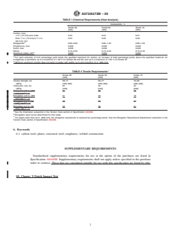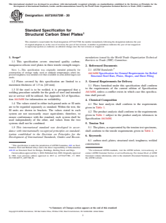 ASTM A573/A573M-20 is a technical specification published by ASTM International. Its full title is "Standard Specification for Structural Carbon Steel Plates". This standard covers: ABSTRACT This specification covers structural quality carbon-manganese-silicon steel plates in three tensile strength ranges intended primarily for service at atmospheric temperatures where improved notch toughness is important. If the steel is to be welded, a welding procedure suitable for the grade of steel and intended use or service shall be utilized. The steel shall be made by fine grain practice. Heat and product analysis shall conform to the chemical composition requirements prescribed for carbon, manganese, phosphorus, sulfur, and silicon. The tension test specimen shall conform to the tensile requirements including tensile strength, yield point, and elongation. SCOPE 1.1 This specification covers structural quality carbon-manganese-silicon steel plates in three tensile strength ranges. Note 1: This specification was originally intended primarily for construction of storage tanks used at ambient temperatures when improved toughness was needed over that available in semi-killed ingot cast steels. 1.2 Plates covered by this specification are limited to a maximum thickness of 1.5 in. [40 mm]. 1.3 If the steel is to be welded, it is presupposed that a welding procedure suitable for the grade of steel and intended use or service will be utilized. See Appendix X3 of Specification A6/A6M for information on weldability. 1.4 The values stated in either inch-pound units or SI units are to be regarded separately as standard. Within the text, the SI units are shown in brackets. The values stated in each system are not necessarily exact equivalents; therefore, to ensure conformance with the standard, each system shall be used independently of the other, and values from the two systems shall not be combined. 1.5 This international standard was developed in accordance with internationally recognized principles on standardization established in the Decision on Principles for the Development of International Standards, Guides and Recommendations issued by the World Trade Organization Technical Barriers to Trade (TBT) Committee.