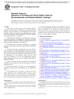SIGNIFICANCE AND USE 4.1 Porosity tests indicate the completeness of protection or coverage offered by the coating. When a given coating is known to be protective when properly deposited, the porosity serves as a measure of the control of the process. The effects of substrate finish and preparation, plating bath, coating process, and handling, may all affect the degree of imperfection that is measured. Note 1: The substrate exposed by the pores may be the basis metal, an underplate, or both. 4.2 The tests in this guide involve corrosion reactions in which the products delineate pores in coatings. Since the chemistry and properties of these products may not resemble those found in service environments, these tests are not recommended for prediction of product performance unless correlation is first established with service experience. SCOPE 1.1 This guide describes some of the available standard methods for the detection, identification, and measurement of porosity and gross defects in electrodeposited and related metallic coatings and provides some laboratory-type evaluations and acceptances. Some applications of the test methods are tabulated in Table 1 and Table 2. 1.2 This guide does not apply to coatings that are produced by thermal spraying, ion bombardment, sputtering, and other similar techniques where the coatings are applied in the form of discrete particles impacting on the substrate. 1.3 This guide does not apply to beneficial or controlled porosity, such as that present in microdiscontinuous chromium coatings. 1.4 Porosity test results (including those for gross defects) occur as chemical reaction end products. Some occur in situ, others on paper, or in a gel coating. Observations are made that are consistent with the test method, the items being tested, and the requirements of the purchaser. These may be visual inspection (unaided eye) or by 10× magnification (microscope). Other methods may involve enlarged photographs or photomicrographs. 1.5 The test methods are only summarized. The individual standards must be referred to for the instructions on how to perform the tests. 1.6 The values stated in SI units are to be regarded as standard. The values given in parentheses are for information only. 1.7 This standard does not purport to address all of the safety concerns, if any, associated with its use. It is the responsibility of the user of this standard to establish appropriate safety, health, and environmental practices and determine the applicability of regulatory limitations prior to use. 1.8 This international standard was developed in accordance with internationally recognized principles on standardization established in the Decision on Principles for the Development of International Standards, Guides and Recommendations issued by the World Trade Organization Technical Barriers to Trade (TBT) Committee.