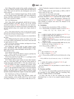 ABSTRACT This test method covers the determination of silica in refuse-derived fuel (RDF), RDF ash, fly ash, bottom ash, or slag. The test method is an acid dehydration gravimetric procedure and is independent of interferences. Silicon compounds shall be dissolved by alkali fusion and dehydrated with hydrochloric acid (HCl). Dehydration is completed by ignition, and the silica is volatilized as silicon tetrafluoride. SCOPE 1.1 This test method covers the determination of silica in refuse-derived fuel (RDF), RDF ash, fly ash, bottom ash, or slag. 1.2 The test method is an acid dehydration gravimetric procedure and is independent of interferences. 1.3 The values stated in SI units are to be regarded as the standard. The values given in parentheses are for information only. 1.4 This standard does not purport to address all of the safety concerns, if any, associated with its use. It is the responsibility of the user of this standard to establish appropriate safety, health, and environmental practices and determine the applicability of regulatory limitations prior to use. For hazard statement, see Section 7. 1.5 This international standard was developed in accordance with internationally recognized principles on standardization established in the Decision on Principles for the Development of International Standards, Guides and Recommendations issued by the World Trade Organization Technical Barriers to Trade (TBT) Committee.
