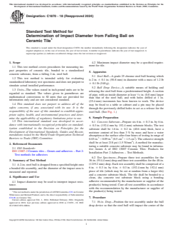 ASTM C1870-18(2024) is a standard published by ASTM International. Its full title is "Standard Test Method for Determination of Impact Diameter from Falling Ball on Ceramic Tile". This standard covers: SIGNIFICANCE AND USE 4.1 Impact diameter may be used to interpret impact resistance. 4.2 Maximum impact diameter may be a specified requirement for tile. SCOPE 1.1 This test method covers procedures for measuring impact properties of ceramic tile, bonded to a standardized concrete substrate, from a falling 2-in. steel ball. 1.2 This test method is intended solely for evaluating standardized laboratory test specimens and does not purport to simulate actual installed performance. 1.3 Units—The values stated in inch-pound units are to be regarded as standard. The values given in parentheses are mathematical conversions to SI units that are provided for information only and are not considered standard. 1.4 This standard does not purport to address all of the safety concerns, if any, associated with its use. It is the responsibility of the user of this standard to establish appropriate safety, health, and environmental practices and determine the applicability of regulatory limitations prior to use. 1.5 This international standard was developed in accordance with internationally recognized principles on standardization established in the Decision on Principles for the Development of International Standards, Guides and Recommendations issued by the World Trade Organization Technical Barriers to Trade (TBT) Committee.
