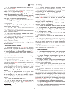 ABSTRACT This specification covers requirements for devices used to determine the release moments of ski equipment in retail sales and rental facilities; it is applicable to the manufacture, repair, and calibration of such devices. Classification: Type I-a device capable of indicating both positive and negative release moments (Mz); Type IA-a device type I with specified limits of linear displacement or angular deflection; Type IB-a type I device limited in use to a specified binding or group of bindings; Type II-a device capable of indicating both positive and negative release moments (My); Type IIA-a type II device with specified limits of linear displacement or angular deflection; Type IIB-a type II device limited in use to a specified binding or group of bindings; and Type III-a device other than type I or type II with specified capability. The test device shall be of a design such that when tested will meet the requirements prescribed. If the device is designed to indicate force, and a distance measurement is required to calculate the moment, the magnitude of the smallest increment of the distance measurement shall not be greater than 5 % of the shortest measurement anticipated. SCOPE 1.1 This specification covers requirements for devices used to determine the release moments of ski equipment in retail sales and rental facilities. 1.2 This specification is applicable to the manufacture, repair, and calibration of such devices. 1.3 This specification is to be used with Test Method F1062. 1.4 The values expressed in newton metres, newtons, and centimetres are to be regarded as the standard. 1.5 The values expressed in units of torque may be converted to the appropriate force values when devices that indicate force are used. 1.6 This international standard was developed in accordance with internationally recognized principles on standardization established in the Decision on Principles for the Development of International Standards, Guides and Recommendations issued by the World Trade Organization Technical Barriers to Trade (TBT) Committee.