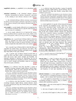 ASTM D7712-18 is a standard published by ASTM International. Its full title is "Standard Terminology for Sampling and Analysis of Asbestos". This standard covers: SCOPE 1.1 This terminology standard is a collective vocabulary relating to sampling and analysis of asbestos. As a convenience to general interest, it contains most of the standard terms, definitions, and nomenclature under the jurisdiction of Committee D22. 1.2 Many of the entries in this terminology are copied (with attribution) from the standards of origin referenced in Section 2. The standards of origin are noted in bold type at the right margin of the applicable definition. 1.3 Certain terms in the common language that comprise multiple concepts are included herein with the definition specific to standards and practices of Committee D22. 1.4 This international standard was developed in accordance with internationally recognized principles on standardization established in the Decision on Principles for the Development of International Standards, Guides and Recommendations issued by the World Trade Organization Technical Barriers to Trade (TBT) Committee.