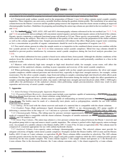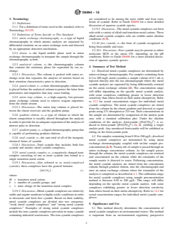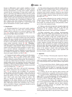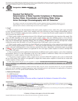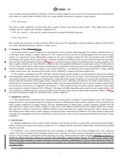 SIGNIFICANCE AND USE 5.1 This method directly determines the concentration of metal cyanide complexes in environmental waters. The method is important from an environmental regulatory perspective because it differentiates metal cyanide complexes of lesser toxicity from metal cyanide complexes of greater toxicity. Previous determinations of strong metal cyanide complexes assumed that the concentration of strong metal cyanide complexes is equivalent to the difference between the total cyanide and the free cyanide. This approach is subject to error because different methods used to determine free cyanide often provide widely varying results, thus impacting the strong metal cyanide complex concentration that is determined by difference. The direct analysis using anion exchange chromatography avoids these method biases and provides for a more accurate and precise determination of metal cyanide complexes. SCOPE 1.1 This test method covers the determination of the metal cyanide complexes of iron, cobalt, silver, gold, copper and nickel in waters including groundwaters, surface waters, drinking waters and wastewaters by anion exchange chromatography and UV detection. The use of alkaline sample preservation conditions (see 10.3) ensures that all metal cyanide complexes are solubilized and recovered in the analysis (1-3).2 1.2 Metal cyanide complex concentrations between 0.20 to 200 mg/L may be determined by direct injection of the sample. This range will differ depending on the specific metal cyanide complex analyte, with some exhibiting greater or lesser detection sensitivity than others. Approximate concentration ranges are provided in 12.2. Concentrations greater than the specific analyte range may be determined after appropriate dilution. This test method is not applicable for matrices with high ionic strength (conductivity greater than 500 meq/L as Cl) and TDS (greater than 30 000 mg/L), such as ocean water. 1.3 Metal cyanide complex concentrations less than 0.200 mg/L may be determined by on-line sample preconcentration coupled with anion exchange chromatography as described in 11.3. This range will differ depending on the specific metal cyanide complex analyte, with some exhibiting greater or lesser detection sensitivity than others. Approximate concentration ranges are provided in 12.2. The preconcentration method is not applicable for silver and copper cyanide complexes in matrices with high TDS (greater than 1000 mg/L). 1.4 The test method may also be applied to the determination of additional metal cyanide complexes, such as those of platinum and palladium. However, it is the responsibility of the user of this standard to establish the validity of the test method for the determination of cyanide complexes of metals other than those in 1.1. 1.5 The presence of metal complexes within a sample may be converted to Metal CN complexes and as such, are altered with the use of this method. This method is not applicable to samples that contain anionic complexes of metals that are weaker than cyanide complexes of those metals. 1.6 The values stated in SI units are to be regarded as standard. The values given in parentheses are mathematical conversions to inch-pound units that are provided for information only and are not considered standard. 1.7 This standard does not purport to address all of the safety concerns, if any, associated with its use. It is the responsibility of the user of this standard to establish appropriate safety and health practices and determine the applicability of regulatory limitations prior to use. For specific hazard statements, refer to Section 9.