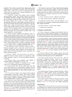 ASTM D6994-15 is a standard published by ASTM International. Its full title is "Standard Test Method for Determination of Metal Cyanide Complexes in Wastewater, Surface Water, Groundwater and Drinking Water Using Anion Exchange Chromatography with UV Detection". This standard covers: SIGNIFICANCE AND USE 5.1 This method directly determines the concentration of metal cyanide complexes in environmental waters. The method is important from an environmental regulatory perspective because it differentiates metal cyanide complexes of lesser toxicity from metal cyanide complexes of greater toxicity. Previous determinations of strong metal cyanide complexes assumed that the concentration of strong metal cyanide complexes is equivalent to the difference between the total cyanide and the free cyanide. This approach is subject to error because different methods used to determine free cyanide often provide widely varying results, thus impacting the strong metal cyanide complex concentration that is determined by difference. The direct analysis using anion exchange chromatography avoids these method biases and provides for a more accurate and precise determination of metal cyanide complexes. SCOPE 1.1 This test method covers the determination of the metal cyanide complexes of iron, cobalt, silver, gold, copper and nickel in waters including groundwaters, surface waters, drinking waters and wastewaters by anion exchange chromatography and UV detection. The use of alkaline sample preservation conditions (see 10.3) ensures that all metal cyanide complexes are solubilized and recovered in the analysis (1-3).2 1.2 Metal cyanide complex concentrations between 0.20 to 200 mg/L may be determined by direct injection of the sample. This range will differ depending on the specific metal cyanide complex analyte, with some exhibiting greater or lesser detection sensitivity than others. Approximate concentration ranges are provided in 12.2. Concentrations greater than the specific analyte range may be determined after appropriate dilution. This test method is not applicable for matrices with high ionic strength (conductivity greater than 500 meq/L as Cl) and TDS (greater than 30 000 mg/L), such as ocean water. 1.3 Metal cyanide complex concentrations less than 0.200 mg/L may be determined by on-line sample preconcentration coupled with anion exchange chromatography as described in 11.3. This range will differ depending on the specific metal cyanide complex analyte, with some exhibiting greater or lesser detection sensitivity than others. Approximate concentration ranges are provided in 12.2. The preconcentration method is not applicable for silver and copper cyanide complexes in matrices with high TDS (greater than 1000 mg/L). 1.4 The test method may also be applied to the determination of additional metal cyanide complexes, such as those of platinum and palladium. However, it is the responsibility of the user of this standard to establish the validity of the test method for the determination of cyanide complexes of metals other than those in 1.1. 1.5 The presence of metal complexes within a sample may be converted to Metal CN complexes and as such, are altered with the use of this method. This method is not applicable to samples that contain anionic complexes of metals that are weaker than cyanide complexes of those metals. 1.6 The values stated in SI units are to be regarded as standard. The values given in parentheses are mathematical conversions to inch-pound units that are provided for information only and are not considered standard. 1.7 This standard does not purport to address all of the safety concerns, if any, associated with its use. It is the responsibility of the user of this standard to establish appropriate safety and health practices and determine the applicability of regulatory limitations prior to use. For specific hazard statements, refer to Section 9.
