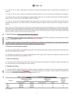 ASTM C410-23 is a technical specification published by ASTM International. Its full title is "Standard Specification for Industrial Floor Brick". This standard covers: ABSTRACT This specification covers brick made from clay or shale or mixtures thereof and are suitable for surfacing industrial floors. Four types of industrial floor bricks are covered: Types T, H, M, and L. Brick shall conform to the physical requirements for the type specified. Tolerances for deviation of face or edges of individual brick from a plane surface and from a straight line, respectively, shall not exceed the maximum values specified. The brick shall be sampled and tested for modulus of rupture, absorption, measurement of size, and measurement of warpage in accordance with the requirements specified and for chemical resistance in accordance with the sulfuric acid solubility test specified. SCOPE 1.1 This specification covers brick made from clay or shale or mixtures thereof and are suitable for surfacing industrial floors. Ceramic shapes known as quarry tile are not covered by this specification. 1.2 The brick covered herein are intended for environments where resistance to chemicals, thermal shock, and/or mechanical shock is required. 1.3 The values stated in inch-pound units are to be regarded as standard. The values given in parentheses are mathematical conversions to SI units that are provided for information only and are not considered standard. 1.4 This standard does not purport to address all of the safety concerns, if any, associated with its use. It is the responsibility of the user of this standard to establish appropriate safety, health, and environmental practices and determine the applicability of regulatory limitations prior to use. 1.5 This international standard was developed in accordance with internationally recognized principles on standardization established in the Decision on Principles for the Development of International Standards, Guides and Recommendations issued by the World Trade Organization Technical Barriers to Trade (TBT) Committee.