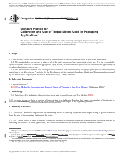 SIGNIFICANCE AND USE 5.1 This practice can be used to check devices used to measure the application and removal torques of continuous or intermittent thread and lug closures. 5.2 This practice can be used to determine the amount of torque to either apply or remove a closure. SCOPE 1.1 This practice covers the calibration and use of torque meters of the type normally used in packaging applications. 1.2 This standard does not purport to address all of the safety concerns, if any, associated with its use. It is the responsibility of the user of this standard to establish appropriate safety, health, and environmental practices and determine the applicability of regulatory limitations prior to use. 1.3 This international standard was developed in accordance with internationally recognized principles on standardization established in the Decision on Principles for the Development of International Standards, Guides and Recommendations issued by the World Trade Organization Technical Barriers to Trade (TBT) Committee.