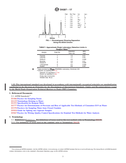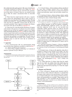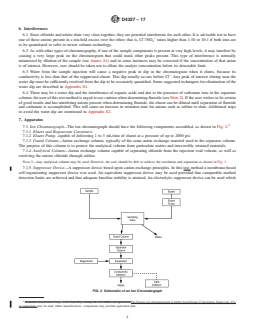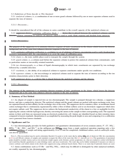 SIGNIFICANCE AND USE 5.1 Ion chromatography provides for both qualitative and quantitative determination of seven common anions, F−, Cl−, NO2−, HPO4 −2, Br−, NO3−, and SO4−2, in the milligram per litre range from a single analytical operation requiring only a few millilitres of sample and taking approximately 10 to 15 min for completion. Additional anions, such as carboxylic acids, can also be quantified. Note 2: This test method may be used to determine fluoride if its peak is in the water dip by adding 1 mL of eluent (at 100× the concentration in 8.3) to all 100-mL volumes of samples and standards to negate the effect of the water dip. (See 6.3, and also see 6.4.) The quantitation of unretained peaks should be avoided. Anions such as low molecular weight organic acids (formate, acetate, propionate, etc.) that are conductive coelute with fluoride and would bias fluoride quantitation in some drinking waters and most wastewaters. The water dip can be further minimized if measures are taken to remove carbonic acid which remain in the eluent after suppression using carbonate based eluents. There is no water dip if hydroxide eluents are used. 5.2 Anion combinations such as Cl−/Br − and NO2−/NO3−, which may be difficult to distinguish by other analytical methods, are readily separated by ion chromatography. SCOPE 1.1 This test method2,3 covers the sequential determination of fluoride, chloride, nitrite, ortho-phosphate, bromide, nitrate, and sulfate ions in water by suppressed ion chromatography. Note 1: Order of elution is dependent upon the column used; see Fig. 1. 1.3 It is the user's responsibility to ensure the validity of this test method for other matrices. 1.4 Concentrations as low as 0.01 mg/L were determined depending upon the anions to be quantified, in single laboratory work. Utilizing a 50-μL sample volume loop and a sensitivity of 3000 μS/cm full scale, the approximate detection limits shown in Table 1 can be achieved. Lower detection limits have been observed with newer instrumentation, column technology and eluents. The analyst must assure optimum instrument performance to maintain a stable baseline at more sensitive conductivity full-scale settings. (A) Data provided by U.S. EPA/EMSL Laboratory, Cincinnati, OH.(B) Column: as specified in 7.1.4. Detector: as specified in 7.1.6. Eluent: as specified in 8.3. Pump rate: 2.0 mL/min. Sample loop: 50 μL. 1.5 The upper limit of this test method is dependent upon total anion concentration and may be determined experimentally as described in Annex A1. These limits may be extended by appropriate dilution or by use of a smaller injection volume. 1.6 Using alternate separator column and eluents may permit additional anions such as acetate, formate, or citrate to be determined. This is not the subject of this test method. 1.7 This test method update approves the use of electrolytically generated eluent, electrolytically regenerated eluent, electrolytic suppression (not autozeroing), and electrolytic trap columns also known as reagent-free ion chromatography. This approval is based on acceptance by the U.S. EPA as referenced in Appendix X2. 1.8 The values stated in SI units are to be regarded as standard. No other units of measurement are included in this standard. 1.9 This standard does not purport to address all of the safety concerns, if any, associated with its use. It is the responsibility of the user of this standard to establish appropriate safety, health, and environmental practices and determine the applicability of regulatory limitations prior to use. 1.10 This international standard was developed in accordance with internationally recognized principles on standardization established in the Decision on Principles for the Development of International Standards, Guides and Recommendations issued by the World Trade Organization Technical Barriers to Trade (TBT) Committee.