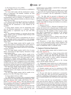 SIGNIFICANCE AND USE 4.1 This practice establishes the basic parameters for the application and control of the digital detector array radiographic method. This practice is written so it can be specified on the engineering drawing, specification, or contract. It will require a detailed procedure delineating the technique or procedure requirements and shall be approved by the Cognizant Engineering Organization (CEO). SCOPE 1.1 This practice establishes the minimum requirements for radiographic examination of metallic and nonmetallic materials using digital detector arrays (DDAs). 1.2 The stated requirements of this specification are based on the use of an X-ray generating source. Additionally, some of the tests and requirements may not be applicable to X-ray energy levels >450kV. 1.3 The requirements in this practice are intended to control the quality of radiographic examinations obtained using DDAs and are not intended to establish acceptance criteria for parts or materials. 1.4 This practice covers the radiographic examination with DDAs including DDAs described in Practice E2597/E2597M such as a device that contains a photoconductor attached to a Thin Film Transistor (TFT) read out structure, a device that has a phosphor coupled directly to an amorphous silicon read-out structure, and devices where a phosphor is coupled to a CMOS (complementary metal–oxide–semiconductor) array, or a CCD (charge coupled device) crystalline silicon read-out structure. 1.5 The requirements of this practice and Practice E2737 shall be used together. The requirements of Practice E2737 will provide the baseline evaluation and long term stability test procedures for the DDA system. The user of the DDA system shall establish a written procedure that addresses the specific requirements and tests to be used in their application and shall be approved by the Cognizant Radiographic Level 3 before examination of production hardware. This practice also requires the user to perform a system qualification suitable for its intended purpose and to issue a system qualification report (see 9.1). 1.6 The DDA shall be selected for an NDT application based on knowledge of the technology described in Guide E2736, and of the selected DDA properties provided by the manufacturer in accordance with Practice E2597/E2597M. 1.7 Techniques and applications employed with DDAs are diverse. This practice is not intended to be limiting or restrictive. Refer to Guides E94/E94M, E1000, and E2736, Terminology E1316, Practices E747 and E1025, and Federal Standards 21-CFR-1020.40 and 29-CFR-1910.96 for a list of documents that provide additional information and guidance. 1.8 This international standard was developed in accordance with internationally recognized principles on standardization established in the Decision on Principles for the Development of International Standards, Guides and Recommendations issued by the World Trade Organization Technical Barriers to Trade (TBT) Committee.