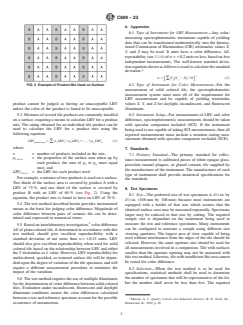 SIGNIFICANCE AND USE 5.1 This test method describes the means of determining the LRV of a tile specimen. Certain building codes require the use of materials rated by LRV. Application of this test method provides the means for rating ceramic tile. LRVs reported for ceramic tile should include reference to the observer and illuminant for which the rating is valid. 5.2 LRV is a property dependent on the overall color of a tile specimen. Control of LRV is achieved through control of color and adherence to color specifications will govern the acceptability of a product with respect to LRV. Therefore, a product cannot be judged as having an unacceptable LRV unless the color of the product is found to be unacceptable. 5.3 Mixtures of several tile products are commonly installed on a surface, requiring a means to calculate LRV for a product mix. The rating obtained for an individual tile product can be used to calculate the LRV for a product mix using the following equation: where: n = number of products included in the mix, p1 to n = the proportion of the surface area taken up by each product; the sum of p1 to pn must equal one), and LRV1 to n = the LRV for each product used. For example, a mixture of two products is used on a surface. Two thirds of the surface area is covered by product A with a LRV of 75 %, and one third of the surface is covered by product B with an LRV of 60 % (see Fig. 2). Using the equation, the product mix is found to have an LRV of 70 %. FIG. 2 Example of Product Mix Used on Surface 5.4 The test method described herein provides instrumental means as the basis for judging color difference. Magnitude of color difference between pairs of ceramic tile can be determined and expressed in numerical terms. 5.5 Based on interlaboratory investigation,3 color difference ΔE of plain-colored tile, if determined in accordance with this test method, should give excellent reproducibility with a standard deviation of not more than σ = ±... SCOPE 1.1 This test method covers the measurement of Light Reflectance Value (LRV) and visually small color difference between pieces of glazed or unglazed ceramic tile, using any spectrophotometer that meets the requirements specified in the test method. LRV and the magnitude and direction of the color difference are expressed numerically, with sufficient accuracy for use in product specification. 1.2 LRV may be measured for either solid-colored tile or tile having a multicolored, speckled, or textured surface. For tile that are not solid-colored, an average reading should be obtained from multiple measurements taken in a pattern representative of the overall sample as described in 9.2 of this test method. Small color difference between tiles should only be measured for solid-color tiles. Small color difference between tile that have a multicolored, speckled, or textured surface are not valid. 1.3 For solid colored tile, a comparison of the test specimen and reference specimen should be made under incandescent, fluorescent and daylight illuminant conditions. The use of multiple illuminants allows the color difference measurement to be made without the risk of wrongly accepting a match when the tiles being compared are metamers (see 3.1.4). 1.4 The values stated in inch-pound units are to be regarded as standard. The values given in parentheses are provided for information only and are not considered standard. 1.5 This standard does not purport to address all of the safety concerns, if any, associated with its use. It is the responsibility of the user of this standard to establish appropriate safety, health, and environmental practices and determine the applicability of regulatory limitations prior to use. 1.6 This international standard was developed in accordance with internationally recognized principles on standardization established in the Decision on Principles for the Development of International Standard...