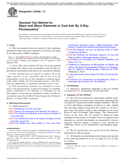 ASTM D4326-21 is a standard published by ASTM International. Its full title is "Standard Test Method for Major and Minor Elements in Coal Ash By X-Ray Fluorescence". This standard covers: SIGNIFICANCE AND USE 5.1 A compositional analysis of ash is used in describing the quality of coal for its complete characterization. Ash composition is useful in predicting slagging and fouling characteristics of combusted materials as well as the potential utilization of ash by-products. 5.2 The chemical composition of laboratory prepared coal ash is rarely, if ever, representative of the composition of the mineral matter in the coal because the ashing process can alter some minerals. However, it can approximate the composition of the fly ash and slag resulting from commercial combustion of coal. SCOPE 1.1 This test method covers the analysis of the commonly determined major and minor elements in ash from coal using X-ray fluorescence (XRF) techniques. Note 1: Test Method D5016 is used for determination of sulfur. Note 2: Although not included in the present method, the determination of barium, strontium, and manganese may be required to yield adequate totals. 1.2 Units—The values stated in SI units are to be regarded as standard. The values given in parentheses after SI units are provided for information only and are not considered standard. 1.3 This standard does not purport to address all of the safety concerns, if any, associated with its use. It is the responsibility of the user of this standard to establish appropriate safety, health, and environmental practices and determine the applicability of regulatory limitations prior to use. 1.4 This international standard was developed in accordance with internationally recognized principles on standardization established in the Decision on Principles for the Development of International Standards, Guides and Recommendations issued by the World Trade Organization Technical Barriers to Trade (TBT) Committee.