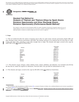 1.1 This test method describes the analysis of titanium and its alloys by spark atomic emission spectrometry (Spark-AES) and glow discharge atomic emission spectrometry (GD-AES). The titanium specimen to be analyzed may be in the form of a disk, casting, foil, sheet, plate, extrusion, or some other wrought form or shape. The elements and ranges covered in the scope by spark-AES of this test method are listed below.