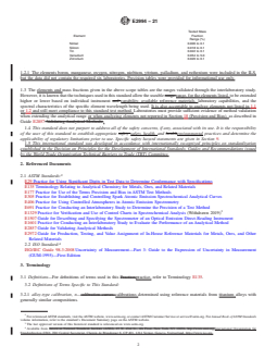 1.3 The elements and mass fractions given in the above scope tables are the ranges validated through the interlaboratory study. However, it is known that the techniques used in this standard allow the useable range, for the elements listed, to be extended higher or lower based on individual instrument capability, available reference materials, laboratory capabilities, and the spectral characteristics of the specific element wavelength being used. It is also acceptable to analyze elements not listed in 1.1 or 1.2 and still meet compliance to this standard test method. Laboratories must provide sufficient evidence of method validation when extending the analytical range or when analyzing elements not reported in Section 18 (Precision and Bias), as described in Guide E2857.