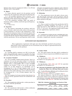 ASTM A578/A578M-17(2023) is a technical specification published by ASTM International. Its full title is "Standard Specification for Straight-Beam Ultrasonic Examination of Rolled Steel Plates for Special Applications". This standard covers: ABSTRACT This procedure covers the standard and acceptance standards for straight-beam, pulse-echo, ultrasonic examination of rolled carbon and alloy steel plates. The amplitude linearity of the apparatus to be used shall be checked by positioning the transducer over the depth resolution notch in the IIW or similar block. The inspection shall be performed in an area free of operations that interfere with proper performance of the test. The test shall be performed either by direct contact, immersion, or liquid column coupling. Grid scanning shall be conducted along a continuous perpendicular line on the center. All discontinuities causing complete loss of reflection shall be recorded. SCOPE 1.1 This specification2 covers the procedure and acceptance standards for straight-beam, pulse-echo, ultrasonic examination of rolled carbon and alloy steel plates, 3/8 in. [10 mm] in thickness and over, for special applications. The method will detect internal discontinuities parallel to the rolled surfaces. Three levels of acceptance standards are provided. Supplementary requirements are provided for alternative procedures. 1.2 Individuals performing examinations in accordance with this specification shall be qualified and certified in accordance with the requirements of the latest edition of ASNT SNT-TC-1A or an equivalent accepted standard. An equivalent standard is one which covers the qualification and certification of ultrasonic nondestructive examination candidates and which is acceptable to the purchaser. 1.3 The values stated in either SI units or inch-pound units are to be regarded separately as standard. The values stated in each system may not be exact equivalents; therefore, each system shall be used independently of the other. Combining values from the two systems may result in non-conformance with the standard. 1.4 This standard does not purport to address all of the safety concerns, if any, associated with its use. It is the responsibility of the user of this standard to establish appropriate safety, health, and environmental practices and determine the applicability of regulatory limitations prior to use. 1.5 This international standard was developed in accordance with internationally recognized principles on standardization established in the Decision on Principles for the Development of International Standards, Guides and Recommendations issued by the World Trade Organization Technical Barriers to Trade (TBT) Committee.