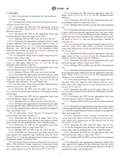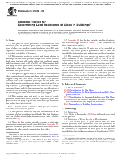 SIGNIFICANCE AND USE 6.1 This practice is used to determine the LR of specified glass types and constructions exposed to uniform lateral loads. 6.2 Use of this practice assumes: 6.2.1 The glass is free of edge damage and is properly glazed. 6.2.2 The glass has not been subjected to abuse. 6.2.3 The surface condition of the glass is typical of glass that has been in service for several years, and is weaker than freshly manufactured glass due to minor abrasions on exposed surfaces. 6.2.4 The glass edge support system is sufficiently stiff to limit the lateral deflections of the supported glass edges to no more than 1/175 of their lengths. The specified design load shall be used for this calculation. 6.2.5 The deflection of glass or support system, or both, shall not result in loss of glass edge support. The glass bite reduction or pullout shall be considered using the method referenced in (1).3 Note 2: Glass deflections are to be reviewed. This practice does not address aesthetic issues caused by glass deflection. Note 3: This practice does not consider the effects of deflection on insulating glass unit seal performance. Note 4: The designer/engineer must determine what constitutes sufficient glass edge support based on Annex A1, Non-Factored Load Charts. 6.3 Many other factors shall be considered in glass type and thickness selection. These factors include but are not limited to: thermal stresses, spontaneous breakage of tempered glass, the effects of windborne debris, excessive deflections, behavior of glass fragments after breakage, blast, seismic effects, building movement, heat flow, edge bite, noise abatement, and potential post-breakage consequences. In addition, considerations set forth in building codes along with criteria presented in safety-glazing standards and site-specific concerns may control the ultimate glass type and thickness selection. 6.4 For situations not specifically addressed in this standard, the design professional shall use enginee... SCOPE 1.1 This practice covers procedures to determine the load resistance (LR) of specified glass types, including combinations of glass types used in a sealed insulating glass (IG) unit, exposed to a uniform lateral load of short or long duration, for a specified probability of breakage. 1.2 This practice applies to vertical and sloped glazing in buildings for which the specified design loads consist of wind load, snow load and self-weight with a total combined magnitude less than or equal to 15 kPa (315 psf). This practice shall not apply to other applications including, but not limited to, balustrades, glass floor panels, aquariums, structural glass members, and glass shelves. 1.3 This practice applies only to monolithic and laminated glass constructions of rectangular shape with continuous lateral support along one, two, three, or four edges. This practice assumes that (1) the supported glass edges for two, three, and four-sided support conditions are simply supported and free to slip in plane; (2) glass supported on two sides acts as a simply supported beam; and (3) glass supported on one side acts as a cantilever. For insulating glass units, this practice only applies to insulating glass units with four-sided edge support. 1.4 This practice does not apply to any form of wired, patterned, sandblasted, drilled, notched, or grooved glass. This practice does not apply to glass with surface or edge treatments that reduce the glass strength. Note 1: Ceramic enamel is known to affect glass load resistance. Consult the manufacturer for guidance. 1.5 This practice addresses only the determination of the resistance of glass to uniform lateral loads. The final thickness and type of glass selected also depends upon a variety of other factors (see 6.3). 1.6 Charts in this practice provide a means to determine approximate maximum lateral glass deflection. Appendix X1 provides additional procedures to determine maximu...