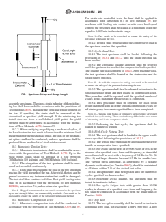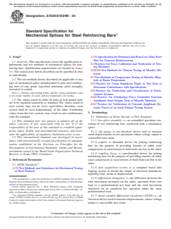 ASTM A1034/A1034M-24 is a technical specification published by ASTM International. Its full title is "Standard Specification for Mechanical Splices for Steel Reinforcing Bars". This standard covers: SIGNIFICANCE AND USE 5.1 Significance: 5.1.1 The bar-splice assembly test specimen shall closely represent the mechanical splice used in practice. The behavior of the bar-splice assembly embedded in concrete, however, may differ from its behavior during testing where it is not embedded in concrete. 5.2 Usefulness: 5.2.1 Testing of mechanical splices for reinforcing bars shall establish the behavior of the bar-splice assembly under the loading conditions described herein for the various test methods to determine the acceptability of the mechanical splice for use in reinforced concrete structural members under specific design criteria. 5.3 Interpretation of Test Results: 5.3.1 Similar or better performance of mechanical splices installed in structural members shall be expected only if materials and methods of assembly are similar to the materials and methods used in the tests. SCOPE 1.1 General—This specification covers the qualification requirements and test methods of mechanical splices for reinforcing bars. Qualification requirements are located in Annex A1. The various tests herein described can be specified in total or individually. 1.2 The test methods herein described are applicable to any type of mechanical splice manufactured to join steel reinforcing bars of any grade (specified minimum yield strength), uncoated or coated. Note 1: Various code-writing bodies specify various parameters, such as test loads, number of cycles and test temperature, for testing. 1.3 The values stated in either SI units or inch-pound units are to be regarded separately as standard. The values stated in each system may not be exact equivalents; therefore, each system shall be used independently of the other. Combining values from the two systems may result in non-conformance with the standard. 1.4 This standard does not purport to address all of the safety concerns, if any, associated with its use. It is the responsibility of the user of this standard to establish appropriate safety, health, and environmental practices and determine the applicability of regulatory limitations prior to use. 1.5 This international standard was developed in accordance with internationally recognized principles on standardization established in the Decision on Principles for the Development of International Standards, Guides and Recommendations issued by the World Trade Organization Technical Barriers to Trade (TBT) Committee.