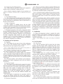 SIGNIFICANCE AND USE 5.1 Significance: 5.1.1 The bar-splice assembly test specimen shall closely represent the mechanical splice used in practice. The behavior of the bar-splice assembly embedded in concrete, however, may differ from its behavior during testing where it is not embedded in concrete. 5.2 Usefulness: 5.2.1 Testing of mechanical splices for reinforcing bars shall establish the behavior of the bar-splice assembly under the loading conditions described herein for the various test methods to determine the acceptability of the mechanical splice for use in reinforced concrete structural members under specific design criteria. 5.3 Interpretation of Test Results: 5.3.1 Similar or better performance of mechanical splices installed in structural members shall be expected only if materials and methods of assembly are similar to the materials and methods used in the tests. SCOPE 1.1 General—This specification covers the qualification requirements and test methods of mechanical splices for reinforcing bars. Qualification requirements are located in Annex A1. The various tests herein described can be specified in total or individually. 1.2 The test methods herein described are applicable to any type of mechanical splice manufactured to join steel reinforcing bars of any grade (specified minimum yield strength), uncoated or coated. Note 1: Various code-writing bodies specify various parameters, such as test loads, number of cycles and test temperature, for testing. 1.3 The values stated in either SI units or inch-pound units are to be regarded separately as standard. The values stated in each system may not be exact equivalents; therefore, each system shall be used independently of the other. Combining values from the two systems may result in non-conformance with the standard. 1.4 This standard does not purport to address all of the safety concerns, if any, associated with its use. It is the responsibility of the user of this standard to establish appropriate safety, health, and environmental practices and determine the applicability of regulatory limitations prior to use. 1.5 This international standard was developed in accordance with internationally recognized principles on standardization established in the Decision on Principles for the Development of International Standards, Guides and Recommendations issued by the World Trade Organization Technical Barriers to Trade (TBT) Committee.