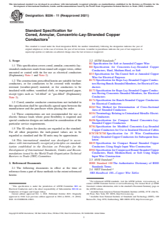 ASTM B226-11(2021) is a technical specification published by ASTM International. Its full title is "Standard Specification for Cored, Annular, Concentric-Lay-Stranded Copper Conductors". This standard covers: ABSTRACT This specification covers cored, annular, concentric-lay-stranded conductors made from round soft copper wires either uncoated or coated with tin for use as electrical conductors. The core may be of any materials and its size and surface firmness as a base for the overlaid wires shall be adequated to prevent forcing or dropping of any wire out of its layer position. No splice shall be made in the conductor as a whole, welds or brazes may be made in the finished individual wires. The materials shall conform to the required nominal conductor size, number of layers of wires, number, diameter, lay-up wires, approximate core diameter, and maximum conductor diameter. The mass per unit length and electrical resistance of a unit length of stranded conductor are a function of the length of lay and shall be calculated. The are of cross section of a conductor shall be considered to be the sum of the cross-sectional areas of its component wires at any section when measured perpendicularly to their individual axes. SCOPE 1.1 This specification covers cored, annular, concentric-lay-stranded conductors made from round soft copper wires, either uncoated or coated with tin for use as electrical conductors (Explanatory Note 1 and Note 2). 1.2 The constructions prescribed herein are suitable for bare conductors, or for conductors to be covered with weather-resistant (weather-proof) material, or for conductors to be insulated with rubber, varnished cloth, or impregnated paper, except types such as “oil-filled” or “gas-filled” (Explanatory Note 3). 1.3 Cored, annular conductor constructions not included in this specification shall be specifically agreed upon between the manufacturer and the purchaser when placing the order. 1.4 These constructions are not recommended for use as electric furnace leads where great flexibility is required and special conductor designs are indicated in consideration of the particular service requirements. 1.5 The SI values for density are regarded as the standard. For all other properties the inch-pound values are to be regarded as standard and the SI units may be approximate. 1.6 This international standard was developed in accordance with internationally recognized principles on standardization established in the Decision on Principles for the Development of International Standards, Guides and Recommendations issued by the World Trade Organization Technical Barriers to Trade (TBT) Committee.